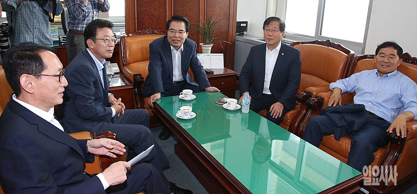 백재현 국회 예산결산위원장(사진 가운데) 및 김도읍(자유한국당)·황주홍(국민의당)·홍철호(바른정당) 등 여야 소위원들이 19일 오전, 서울 여의도 국회 예결위원장실서 추경예산안 등을 논의하고 있다.