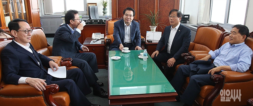 백재현 국회 예산결산위원장(사진 가운데) 및 김도읍(자유한국당)·황주홍(국민의당)·홍철호(바른정당) 등 여야 소위원들이 19일 오전, 서울 여의도 국회 예결위원장실서 추경예산안 등을 논의하고 있다.