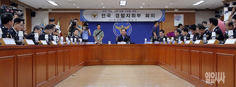 김부겸 행정안전부장관(사진 가운데)이 3일 오전 서울 서대문구 경찰청서 열린 '전국 경찰지휘부 회의'에 참석해 모두발언을 하고 있다.