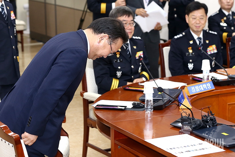 김부겸 행정안전부장관이 3일 오전 서울 서대문구 경찰청에서 열린 '전국 경찰지휘부 회의'에 참석해 인사를 하고 있다.
