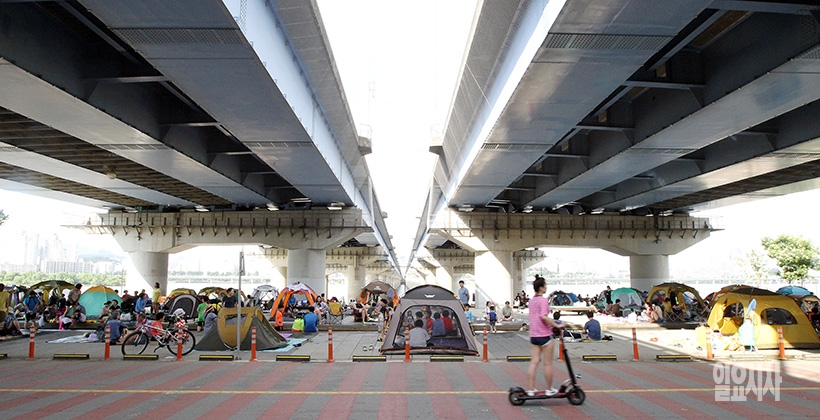 서울을 포함한 수도권 전역에 폭염경보가 발효중인 가운데 3일 오후 서울 여의도 마포대교 남단 아래 시민들이 더위를 식히고 있다.
