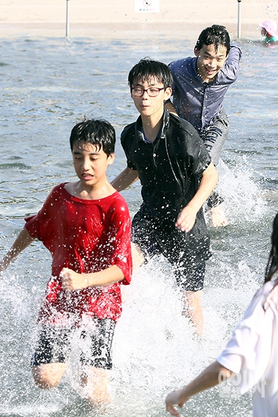 서울을 포함한 수도권 전역에 폭염경보가 발효중인 가운데 3일 오후 서울 여의도 한강공원 물빛광장에서 아이들이 물놀이를 하고 있다.