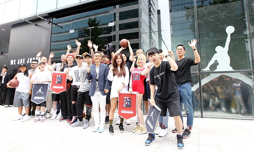 가수 소유, DJ소다, 허재 농구대표팀 감독, SK나이츠 김선형 선수, 양재민 U19 국가대표 농구 선수, 조던홍대 임직원 등이 가 4일 오전 서울 마포구 조던 브랜드 콘셉트 매장 '조던홍대' 오픈 행사에서 포토타임을 갖고 있다.