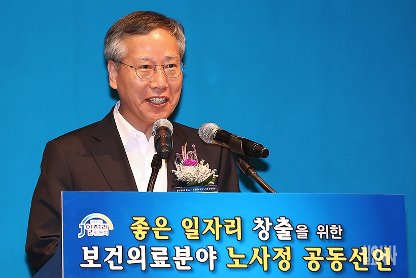 반장식 일자리 수석비서관이 23일 오후 서울 용산구 백범기념관에서 열린 '보건·의료 분야 좋은 일자리 창출을 위한 노사정 공동선언식'에 참석해 인사말을 하고 있다.