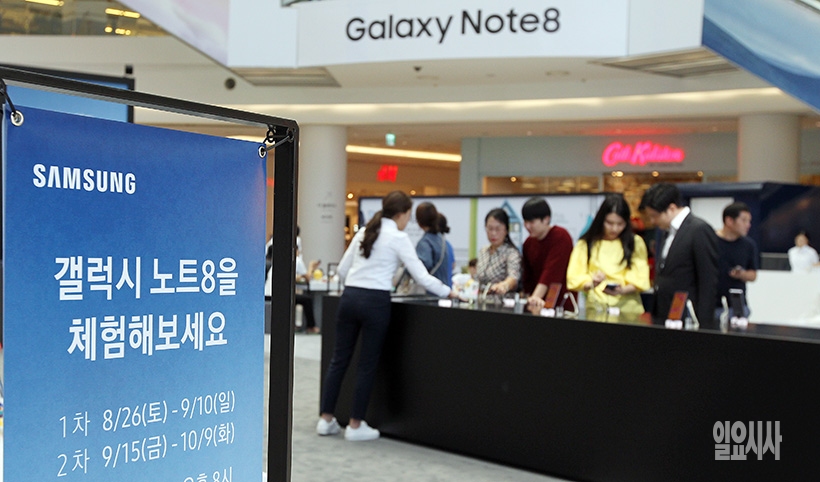 삼성전자가 갤럭시 노트8 출시를 앞두고 29일 오후 서울 영등포구 타임스퀘어에 마련된 갤럭시 노트8 체험존에서 고객들이 제품 설명을 듣고 있다.