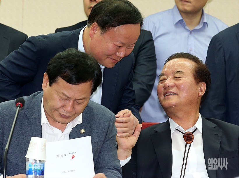 김재원 자유한국당 의원과 정갑윤 의원(사진 오른쪽)이 29일, 서울 여의도 국회 자유한국당 당사서 열린 시도당위원장 회의에 앞서 반갑게 인사를 나누고 있다.