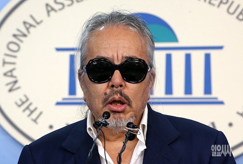 들국화 멤버 전인권이 안민석(더불어민주당)·추혜선(정의당) 의원 등과 함께 6일, 서울 여의도 국회 정론관서 ‘김광석법’ 관련 기자회견을 갖고 있다.
