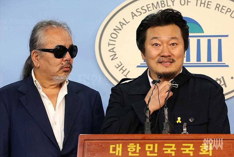 영화 <김광석>의 감독인 이상호 기자(사진 오른쪽), 들국화 멤버 전인권, 안민석(더불어민주당)·추혜선(정의당) 의원 등이 6일, 서울 여의도 국회 정론관서 ‘김광석법’ 관련 기자회견을 갖고 있다.