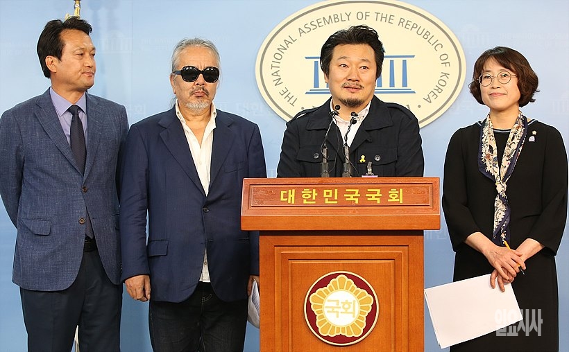 영화 <김광석> 감독인 이상호 기자(사진 오른쪽서 두 번째), 들국화 멤버 전인권(왼쪽서 두 번째), 안민석(더불어민주당, 왼쪽)·추혜선(정의당) 의원 등이 6일, 서울 여의도 국회 정론관서 ‘김광석법’ 관련 기자회견을 갖고 있다.