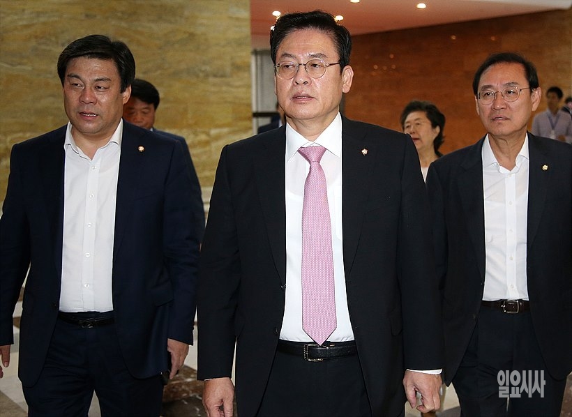 정우택 자유한국당 원내대표(사진 가운데)와 김선동 원내수석부대표 등이 6일, 서울 여의도 국회서 열린 안보 의원총회에 참석하기 위해 이동하고 있다.