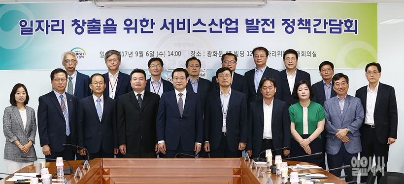 일자리위원회 이용섭 부위원장 등 참석자들이 6일 오후 종로구 광화문 일자리위원회서 열린 '서비스산업 발전을 통한 일자리 창출 정책간담회'에 참석해 기념촬영을 하고 있다.