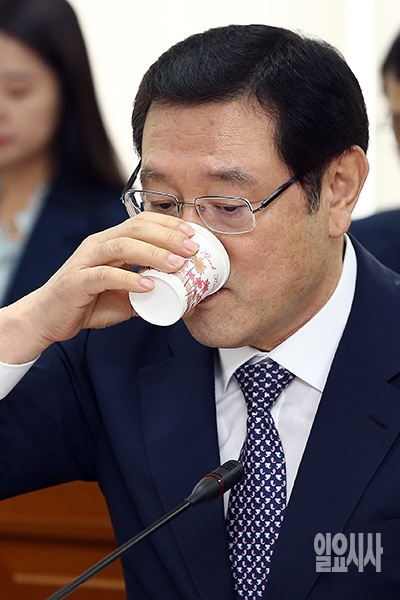일자리위원회 이용섭 부위원장이 6일 오후 종로구 광화문 일자리위원회서 열린 '서비스산업 발전을 통한 일자리 창출 정책간담회'에 참석해 물을 마시고 있다.