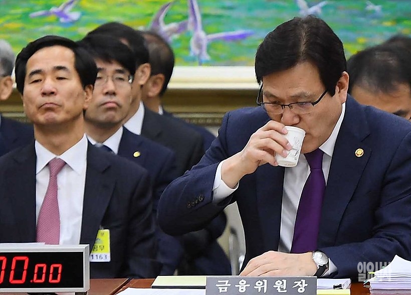 최종구 금융위원장이 30일, 서울 여의도 국회 정무위원회 회의실서 속개된 금융위원회에 대한 국정감사에 출석해 목이 타는 듯 물을 들이키고 있다.