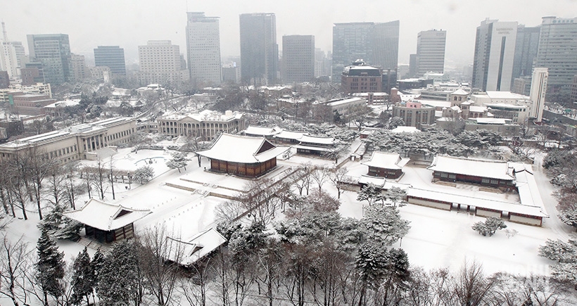 서울에 올겨울 첫 대설주의보가 내려진 18일 오전 서울 중구 덕수궁에 눈이 하얗게 쌓여 있다.
