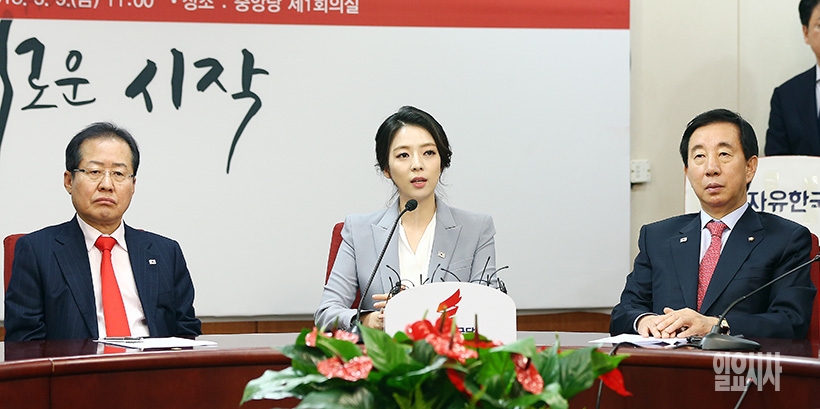 배현진 전 MBC 앵커(가운데)가 9일 오전 서울 여의도 자유한국당 당사에서 열린 영입인사 환영식에 참석해 입당 소감을 말하고 있다.