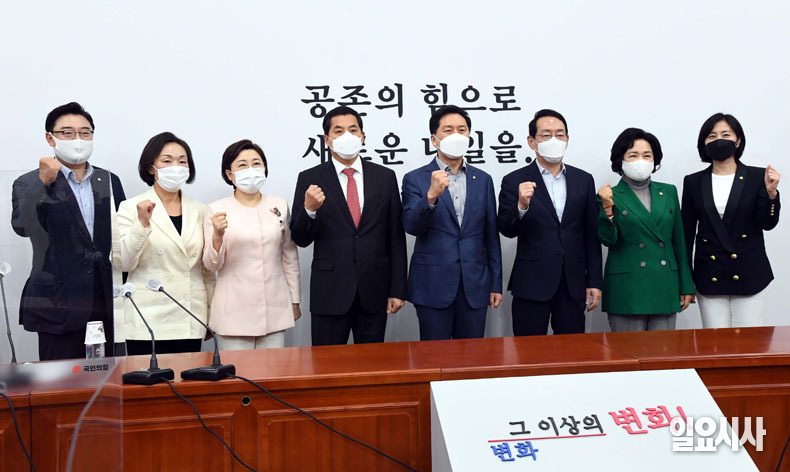 국민의힘 김기현 원내대표 등 참석자들이 30일 오후 서울 여의도 국회에서 열린 국민의힘 '탈원전 피해 및 국토파괴 대책 특위' 1차 회의에서 구호를 외치고 있다.