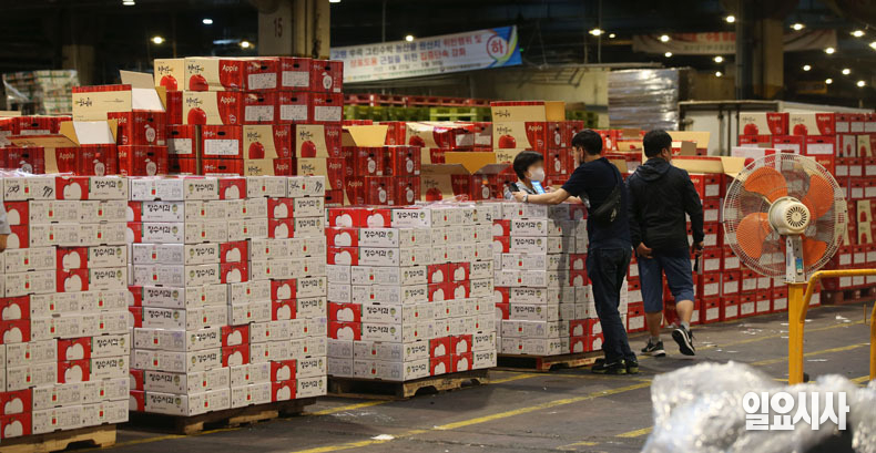 추석을 앞둔 7일 오전 서울 송파구 가락농수산물종합도매시장(가락시장)에 과일 상자들이 가득 쌓여있다.