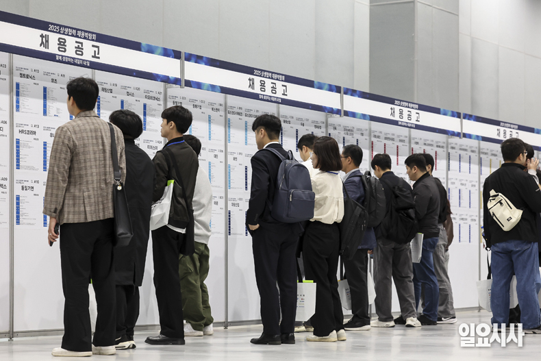 21일 오전 서울 강서구 코엑스마곡에서 열린 '2025 상생협력 채용박람회'를 찾은 구직자들이 채용공고 게시판을 살펴보고 있다.