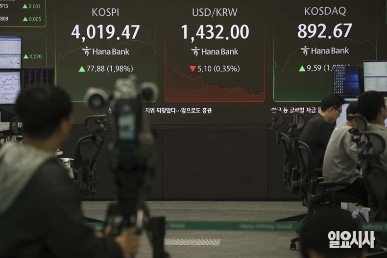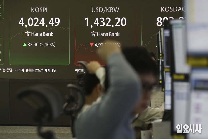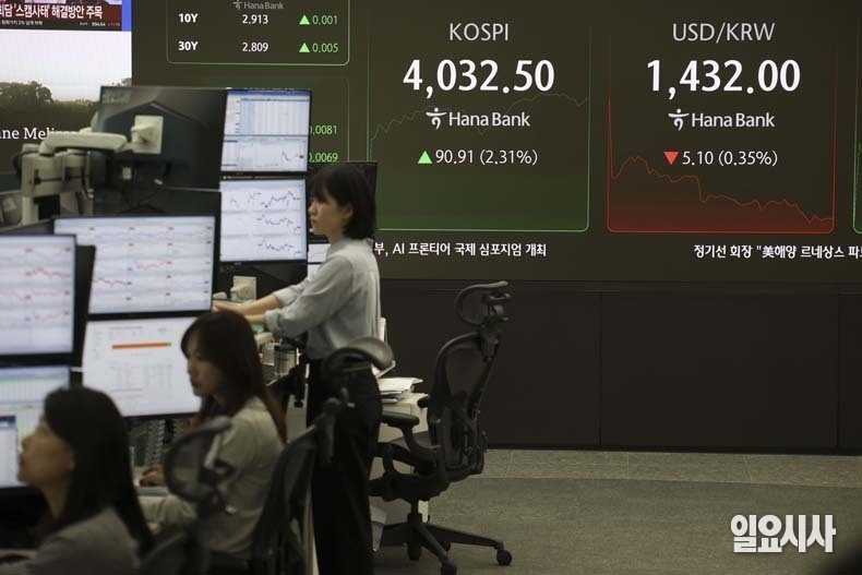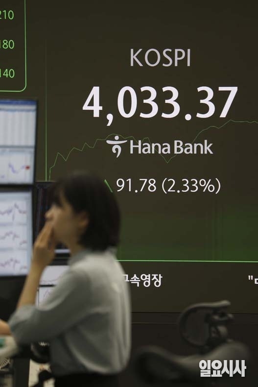 코스피가 사상 처음 장중 4000선을 돌파한 가운데 27일 오전 서울 중구 하나은행 본점 딜링룸 전광판에 코스피 지수가 표시되고 있다.