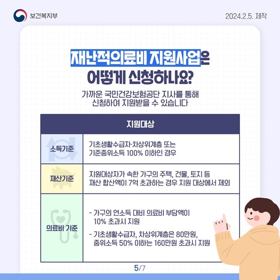 재산 기준도 과세표준 7억원 이하로 완화됐고, 의료비 부담률 요건은 기존의 ‘연소득 대비 15% 초과’에서 ‘10% 초과’로 낮아졌다. 입원 진료는 기존과 마찬가지로 모든 질환에 대해 신청할 수 있었지만, 완화된 심사 기준이 적용되면서 실제 승인 가능성이 크게 높아졌다.