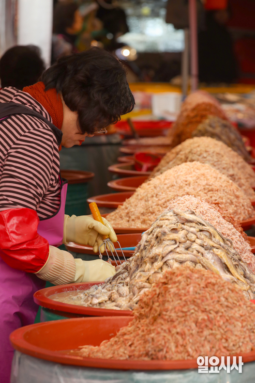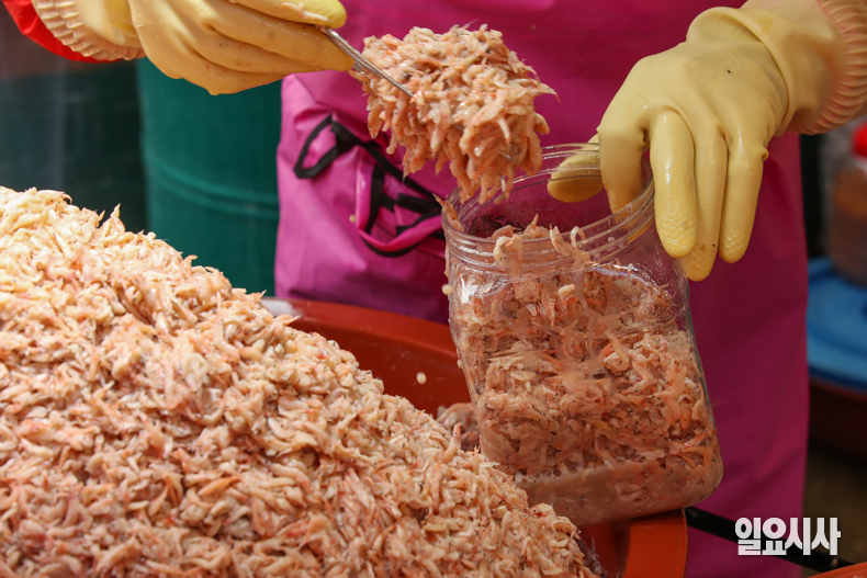 본격적인 김장철을 맞은 24일 오전 인천 남동구 소래포구 전통어시장에서 상인이 손님에게 판매할 새우젓을 통에 담고 있다.