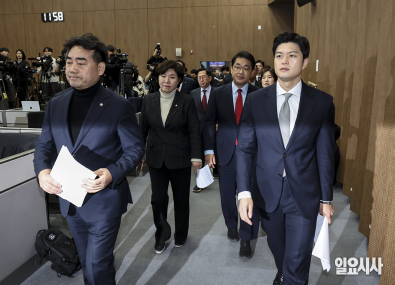 국민의힘 이성권, 조은희, 배준영, 김용태 의원 등 참석자들이 3일 서울 여의도 국회 소통관에서 열린 12.3 비상계엄 관련 입장발표 기자회견에 참석하고 있다.