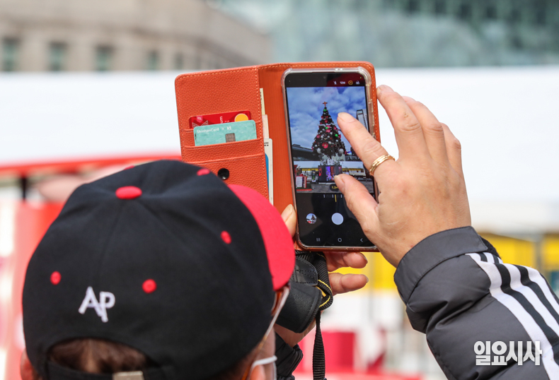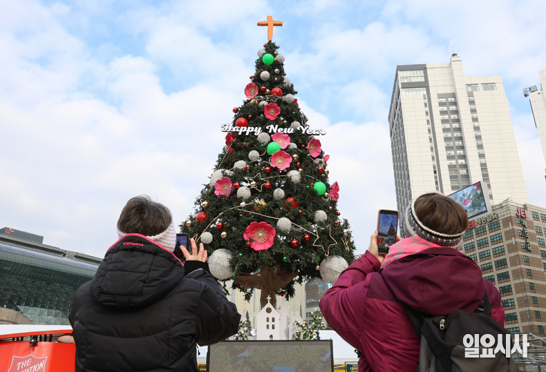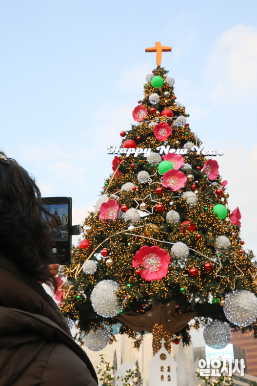 크리스마스를 열흘 앞둔 15일 오후, 길을 지나는 시민들이 서울 중구 서울광장에 설치된 대형 성탄트리 사진을 촬영하고 있다.