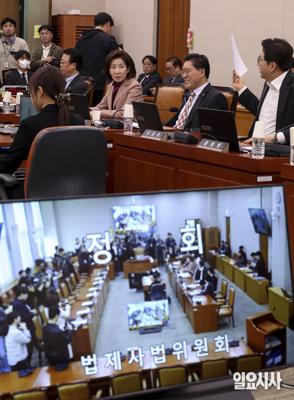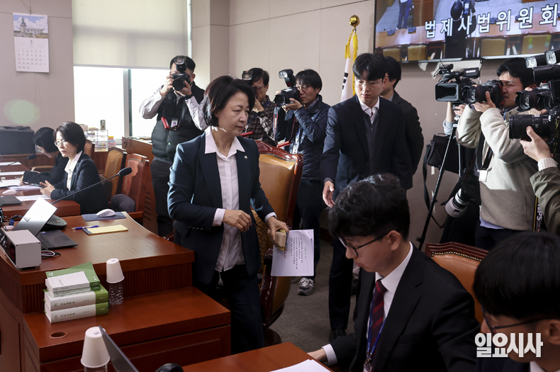 추미애 법제사법위원회 위원장이 16일 오후 서울 여의도 국회에서 열린 법제사법위원회 전체회의에서 정회를 선포하며 의사봉을 두드리고 있다. 국민의힘 측 의원들이 추 위원장에게 발언권을 달라며 손을 들고 있다.
