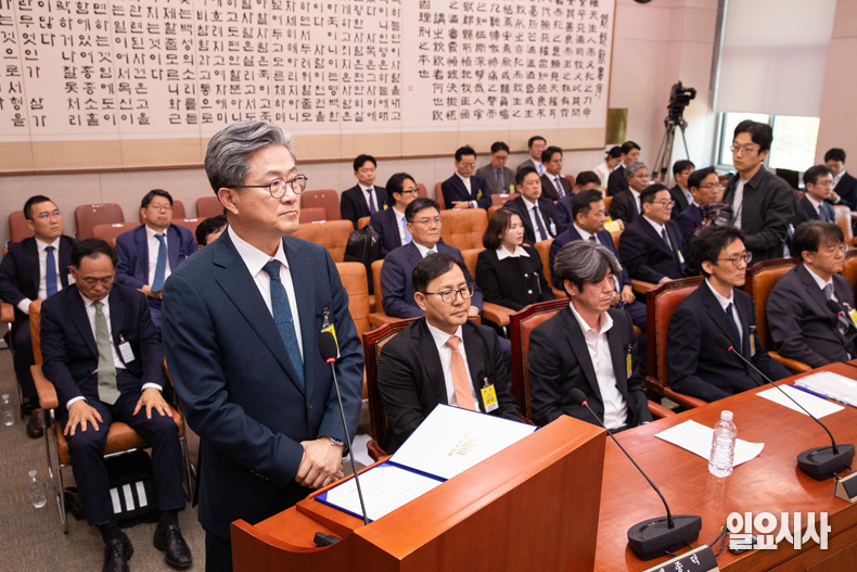 정순욱 전 경기도지사 비서실장이 16일 오후 서울 여의도 국회에서 열린 ‘정치검찰 조작기소 진상규명을 위한 국정조사특별위원회(국조특위)’에 출석해 증인선서를 하고 있다.