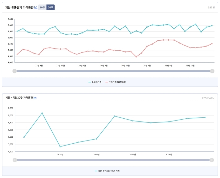 연도별 흐름을 보면 계란 소비자가격은 지난 2020년 HPAI로 급등한 이후 예년 수준으로 되돌아오지 않은 채 높은 가격대를 유지하고 있다. 최근 가격 흐름 역시 단기간 급등이라기보다 이미 형성된 가격대에서 소폭 변동한 모습이다.