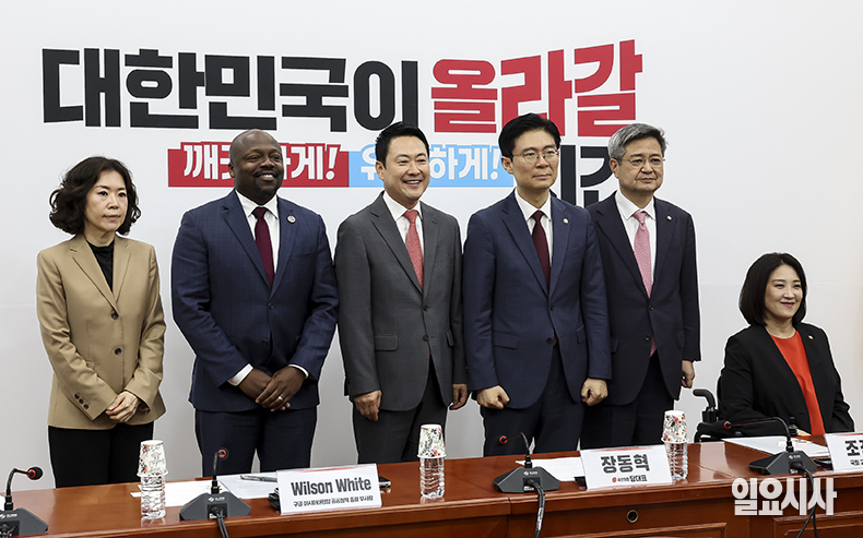 국민의힘 장동혁 대표를 비롯한 참석자들이 28일 오후 서울 여의도 국회에서 열린 '아동청소년 SNS중독, 플랫폼의 보호책임 강화를 위한 긴급좌담회'에서 기념촬영을 하고 있다. 사진 왼쪽부터 황성혜 구글코리아 대외협력정책실 부사장, 윌슨 화이트 구글 아시아태평양 공공정책 총괄 부사장, 장 대표, 최보윤 수석대변인.