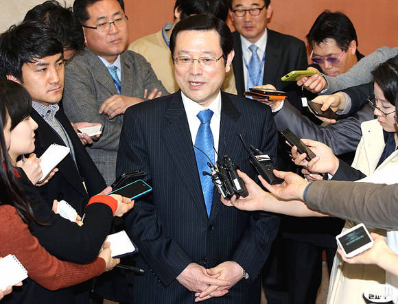 민주통합당 정책위의장을 지낸 이용섭 의원이 5일 오전, 국회 정론관에서 5·4 전당대회 출마를 공식 선언한 후 기자들의 질문에 답변하고 있다.