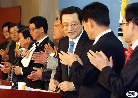 민주통합당 정책위의장을 지낸 이용섭 의원(사진 중앙)이 5일 오전, 국회 정론관에서 5·4 전당대회 출마를 공식 선언하는 기자회견을 열고 있다.