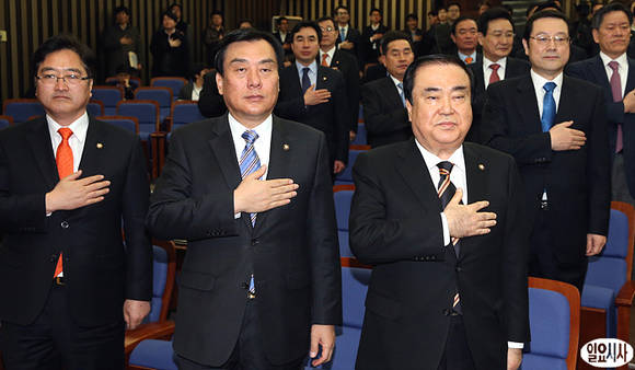 5일 오전 민주통합당 의원총회가 열린 서울 여의도 국회 246호실에서 문희상 비대위원장(사진 우), 박기춘 원내대표(사진 중앙), 우원식 원내수석부대표가 의총 직전, 국기에 대한 경례를 하고 있다.