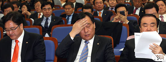 5일 오전 민주통합당 의원총회가 열린 서울 여의도 국회 246호실에서 우원식 원내수석부대표, 박기춘 원내대표, 문희상 비대위원장(사진 좌측부터)이 착찹한 표정을 짓고 있다.