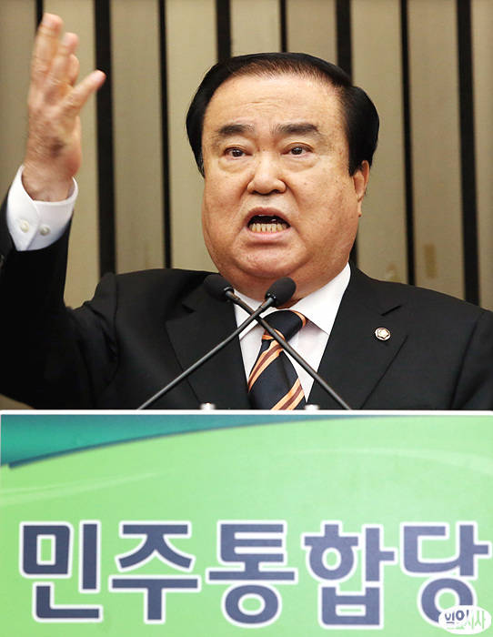5일 오전 열린 서울 여의도 국회 246호실에서 열린 민주통합당 의원총회에서 문희상 비대위원장이 목청 높여 발언하고 있다.