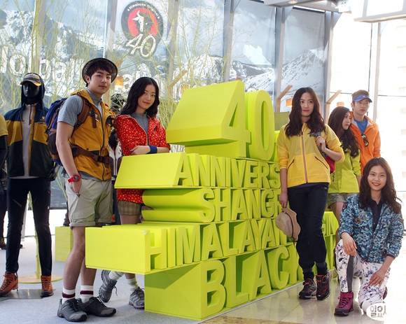 아웃도어 기업 '블랙야크'가 창립 40주년을 맞아 5일 오후 서울 서대문구 홍은동 그랜드힐튼호텔에서 창립 기념식 'Global Challenge 2013'을 열고 있는 가운데 모델들이 포즈를 취하고 있다.