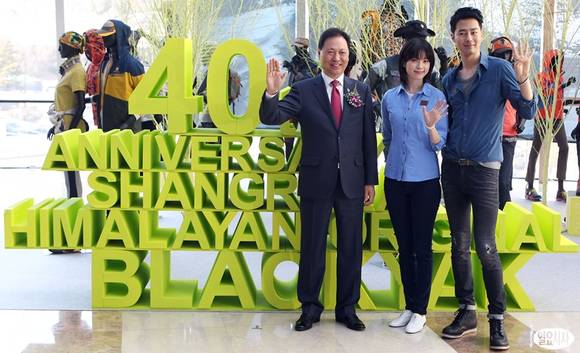 5일 오후 서울 서대문구 홍은동 그랜드힐튼호텔에서 열린 '블랙야크 40주년 창립기념식'에서 (왼쪽부터)강태선 블랙야크 회장, 전속모델인 한효주, 조인성이 포토타임을 갖고 있다.