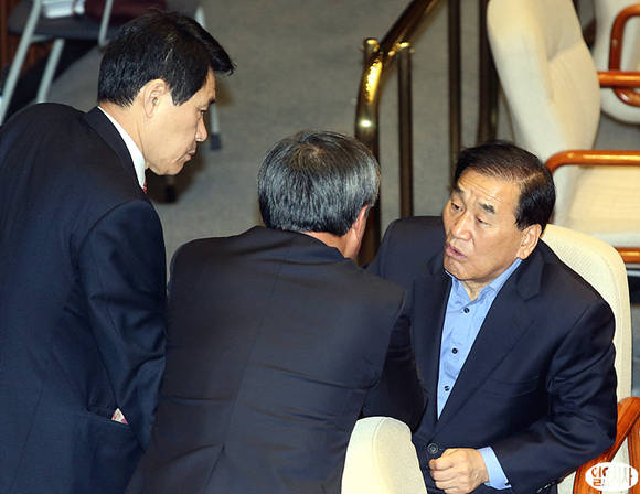 35일간 국회를 표류하던 정부조직개편안 처리가 민주통합당 등 야당의 반발로 물건너감에 따라 새 정부가 언제 정상가동될지도 기약이 없는 상황이 이어지고 있다. 새누리당 이재오 의원과 이군현 의원 등이 5일, 본회의장 안에서 대화를 나누고 있다.