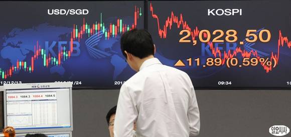 미국 증권시장에서 다우지수가 사상 최고치를 경신한 가운데 6일 오전 코스피 지수가 2020선 후반대를 오르내리고 있다. 사진은 이날 서울 중구 외혼은행 본점 딜링룸.