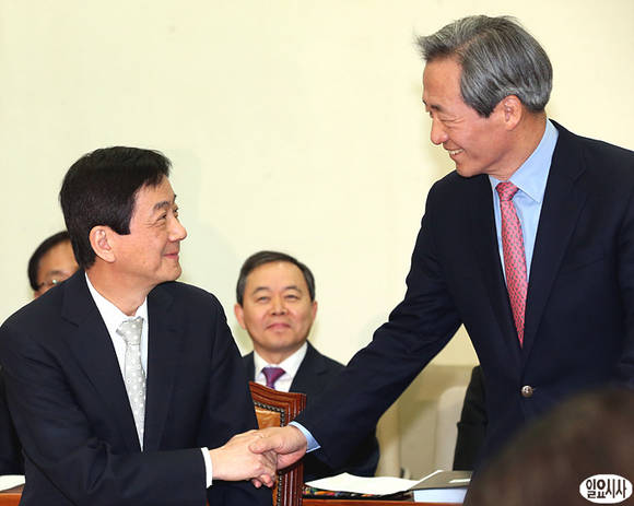 진영 보건복지부 장관 내정자(사진 좌)가 6일 오전, 서울 여의도 국회에서 열린 인사청문회에서 정몽준 새누리당 의원과 인사를 나누고 있다.