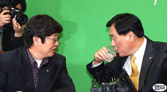 민주통합당 박기춘 원내대표가 6일 오후, 국회 원내대표실에서 열린 정부조직법 개편관련 긴급 기자회견 도중 물을 들이키고 있다.