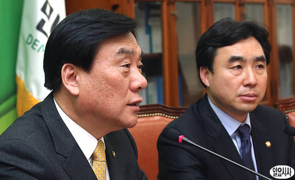 민주통합당 박기춘 원내대표(사진 좌)와 윤관석 원내대변인이 6일 오후 국회 원내대표실에서 열린 정부조직법 개편관련 긴급 기자회견을 열고 있다.