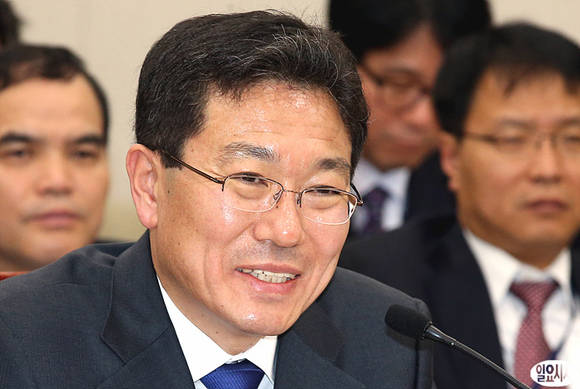 윤상직 산업통상자원부 장관 내정자가 7일, 국회에서 열린 지식경제위원회 인사청문회에서 인사청문위원들의 질의 도중 웃음 짓고 있다.