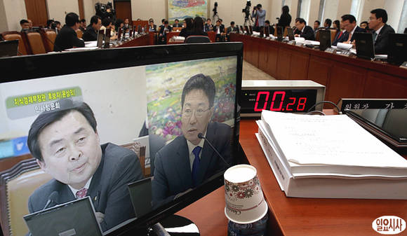 윤상직 산업통상자원부 장관 내정자가 7일, 국회에서 열린 지식경제위원회 인사청문회에서 인사청문위원들의 질의에 답변하는 모습이 위원장 탁자 위의 LCD 수상기에 표시되고 있다.