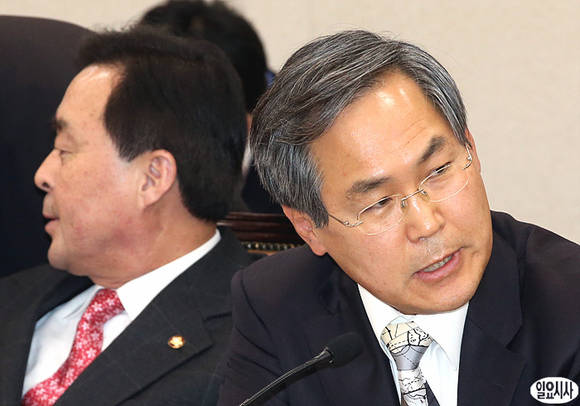 윤상직 산업통상자원부 장관 내정자가 7일, 국회에서 열린 지식경제위원회 인사청문회에서 민주통합당 우윤근 의원의 질의를 받고 있다.