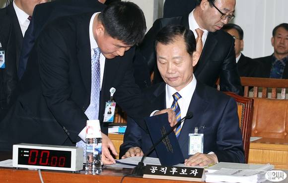 김병관 국방부 장관 후보자가 8일 오전 서울 여의도 국회 국방위원회 전체회의실에서 열린 인사청문회에 참석해 관계자와 함께 선서문을 점검하고 있다.