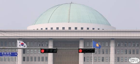 여야의 대립으로 정부조직법 개편안 협상은 진통을 거듭하고 있는 가운데 8일 서울 여의도 국회의사당 앞 신호등에 빨간불이 켜져 있다.