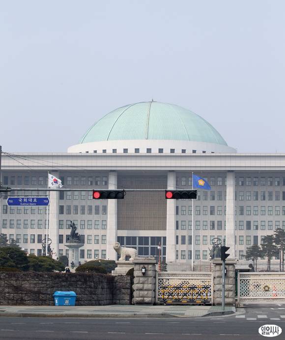 여야의 대립으로 정부조직법 개편안 협상은 진통을 거듭하고 있는 가운데 8일 서울 여의도 국회의사당 앞 신호등에 빨간불이 켜져 있다.
