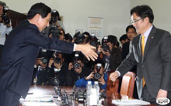 새누리당 김기현 원내수석부대표와 민주통합당 우원식 원내수석부대표가 8일 오후 서울 여의도 국회에서 정부조직 개편안 관련 여야 회담을 가기기 전 악수를 하고 있다.